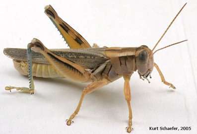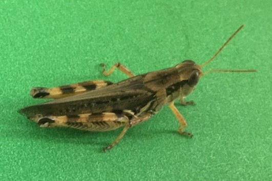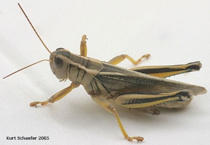 Adult packard grasshoppers are grey to dark yellow in colour with light stripes behind their eyes.