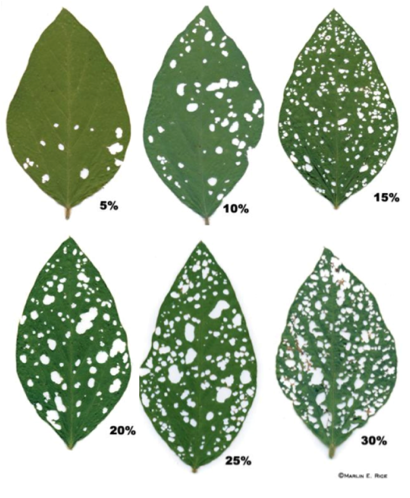 2. Defoliation is the second way to measure economic threshold for grasshoppers, and it involves selecting 2 plants at random from 5 different areas of the field and estimating the percentage of defoliation. The defoliation method is most commonly used in soybeans.