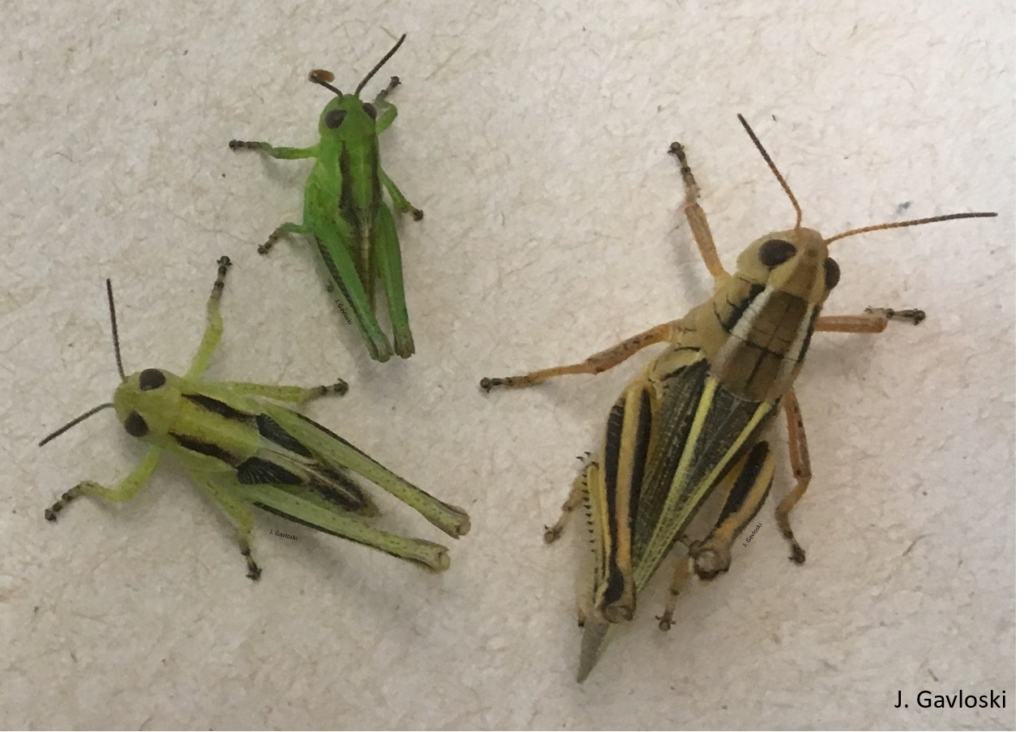 Two-striped grasshoppers are more commonly found around heavy texture soils, and while they feed on both grasses and broadleafs, they actually prefer broadleafs.